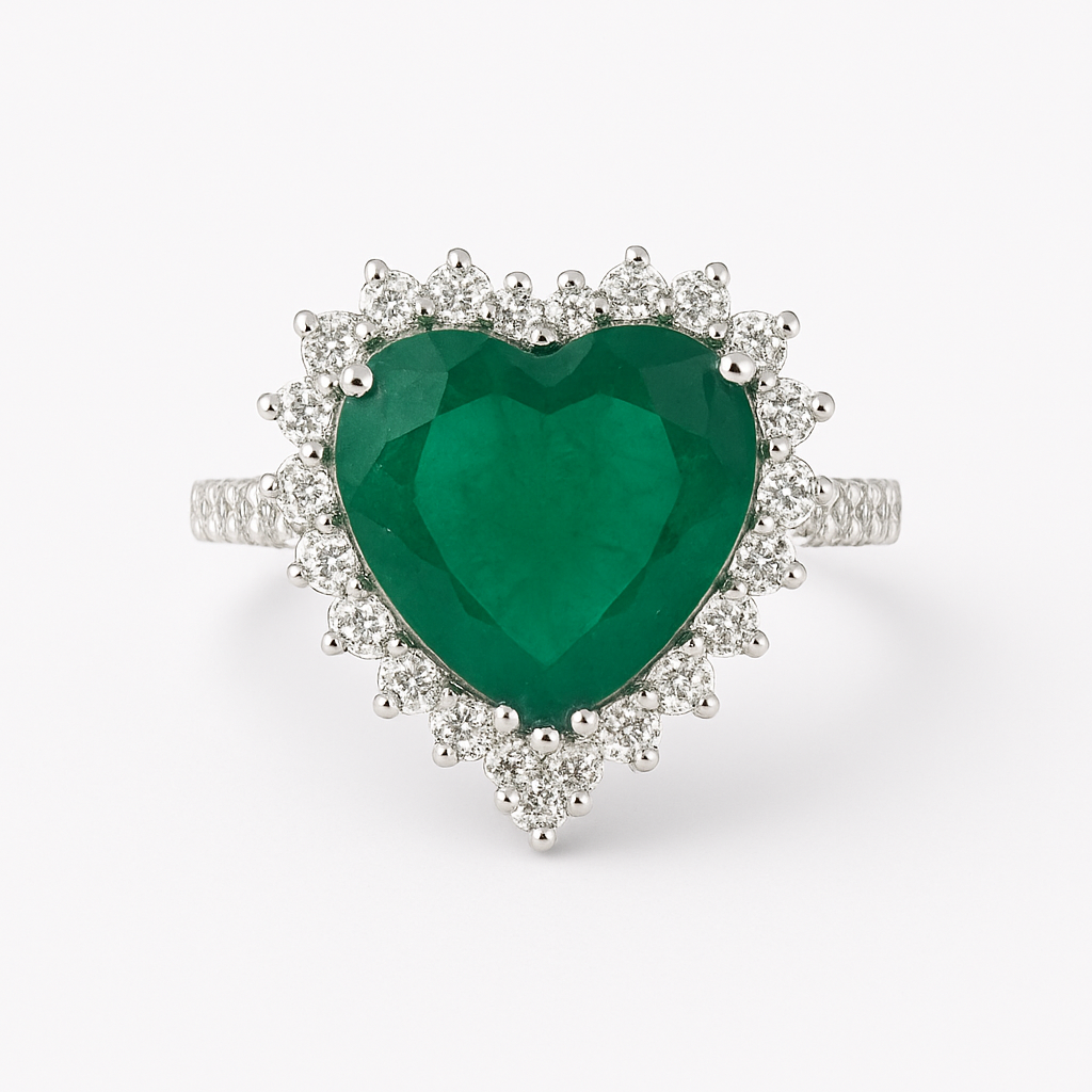 Romantic, elegant, and timeless — this heart-shaped Zambian emerald and diamond ring is a true expression of love and luxury, perfect for both special occasions and everyday sophistication.